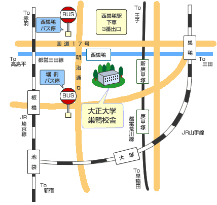 | JR | 池袋駅東口から都営バス浅草雷門行か西新井行「西巣鴨」又は「堀割」下車徒歩2分 板橋駅から徒歩10分 巣鴨駅から都営地下鉄三田線に乗り換え、西高島平行「西巣鴨駅」下車徒歩2分 |